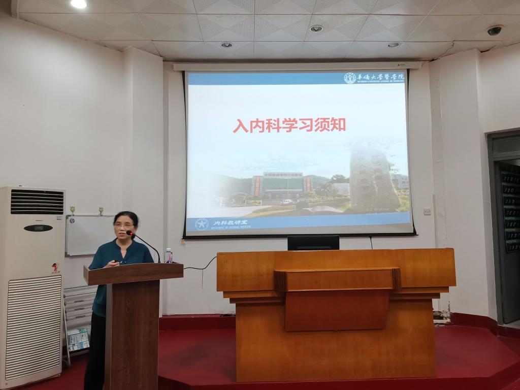 会议的第二个议程,由教研室主任胡团敏教授简要介绍内科概况及学生入科学习要求。尤其是入科见习的注意事项,如何做到有效地巩固理论知识、增加临床知识、加强医患沟通能力,培养良好的从医素质和临床思维方法以及解决临床问题的实际工作的初步能力。