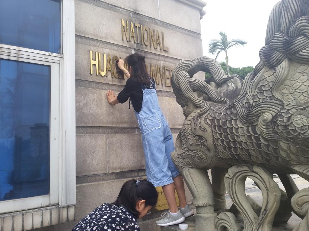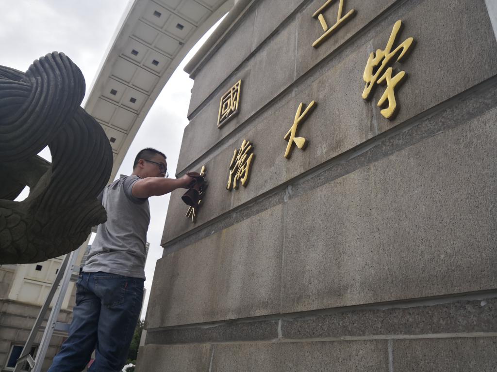 考虑到保洁对象的特殊性,第三党支部充分利用实验员的专业优势,集体讨论后,最终确定了“蒸馏水、脱脂棉、润湿式擦拭、中午太阳速干”这种较为专业的保洁方案。活动过程中,大家齐心协力,克服困难,站凳子,爬梯子,上上下下,场面火热,干劲十足,耐心、仔细地擦拭金字招牌的一笔一划。此次活动持续近2个小时,虽然每个党员同志都累得满头大汗,但看到学校的招牌大字在自己手中变得光彩绚丽,成就感和自豪感就油然而生。