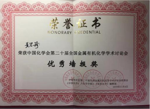 大会围绕金属有机化学的各个研究领域进展,分别以报告及墙报等形式进行了广泛而深入的学术交流。我院崔秀灵教授带领其课题组成员参加了本次会议,并受邀在大会上做了其课题组最新进展的专题学术报告。其本人指导的2016级硕士研究生黄思琦同学采用墙报形式展示他本人最新的研究成果,获得了与会专家一致好评, 被授予“优秀墙报奖”。这是继该团队林兴同学(第十九届全国金属有机化学学术讨论会)获此殊荣后再次获得。