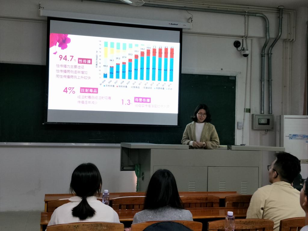 七位同学根据自己对艾滋病的了解以及前期培训的内容,针对艾滋病的流行趋势、危害性以及预防办法、病毒检测和疾病治疗等方面做了简要讲解。