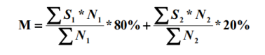 其中,M 为课程考核分数,S1 为学位课(含必修课)成绩, N1 为该课程学分,S2 为非学位课成绩,N2 为该课程学分。成绩按百分制计算。课程综合成绩=M×50%。