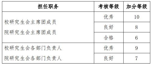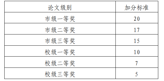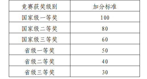备注:如独立获奖,按照以上分值进行加分;如团队获奖,前三名分别按照占比 90%、70%、50%进行折算加分,团队其他人按照国家级 15 分、省级 10 分进行计算。