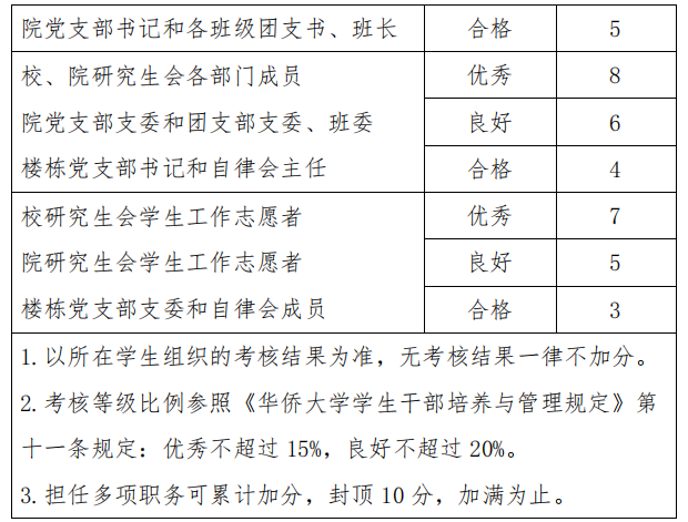 (二)二年级以上博士生、硕士生:综合评定总分(100 分)=基础性素质 80 分(德育素质 10分+科研成果 70 分)+拓展性素质 20 分(文体艺术 5 分+科创活动 5 分+社会服务 10 分)。另设附加分 5 分。